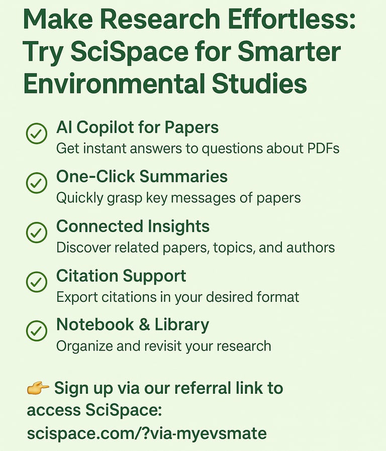 At MyEvsMate, we strive to empower students, researchers, and change-makers with tools that make environmental research easier, faster, and more impactful. If you're tired of spending hours decoding scientific papers or juggling references, it's time to try SciSpace — your all-in-one AI research assistant.